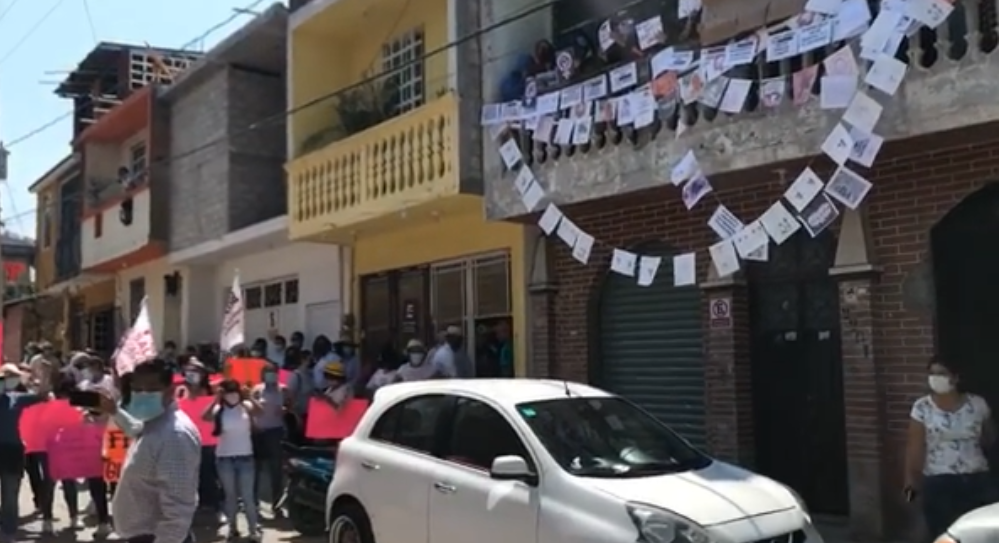 En la escena se puede observar que las simpatizantes se encuentran a escasos metros de una casa en la que otro grupo de mujeres, feministas al parecer, han colocado un tendedero con imágenes y frases en contra de Salgado Macedonio.