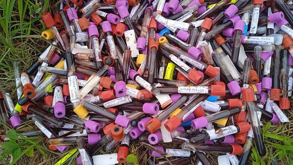Estos últimos levantaron los tubos de las muestras de sangre, los cuales incluso todavía poseían los nombres impresos de cada persona a la que pertenecía la sangre recolectada en los tubos de muestra.