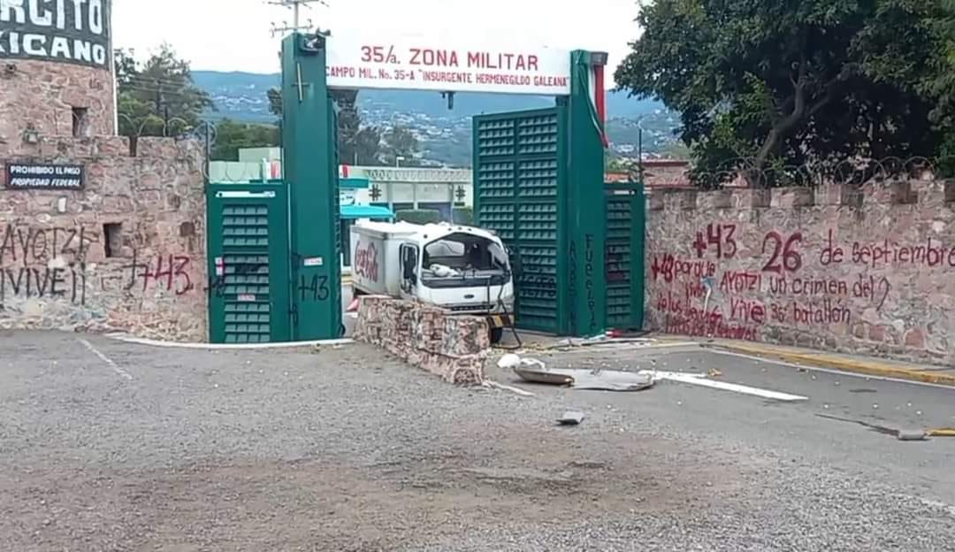 Al exterior de la zona militar los manifestantes pintaron consignas y utilizaron un camión de una empresa refresquera para derribar el portón dejando al descubierto las instalaciones militares. Además, lanzaron petardos al interior de las instalaciones militares.