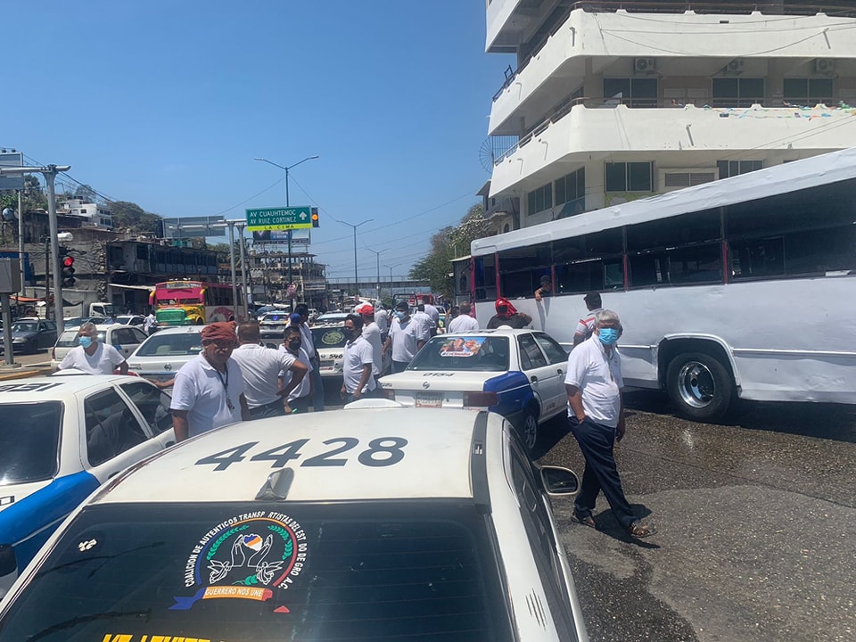 Acapulco de Juárez, Gro.- Chóferes del transporte público bloquearon y protestaron en la carretera federal México – Acapulco a la altura de La Cima para denunciar amenazas por parte de efectivos del Ejército que se encuentran en Acapulco. La manifestación inició alrededor de las 11:00 de la mañana del viernes y contó con la participación de chóferes de taxis colectivos, azul con blanco, rutas alimentadoras y camionetas.