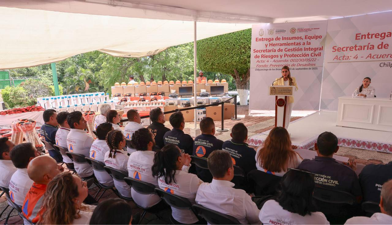 Chilpancingo de los Bravo, 21 de septiembre 2023.-La gobernadora Evelyn Salgado Pineda reafirmó el compromiso con la seguridad y el bienestar de las familias de Guerrero al entregar insumos, equipos y herramientas de trabajo al personal de la Secretaría de Gestión Integral de Riesgos y Protección Civil del Estado de Guerrero (SGIRPC).