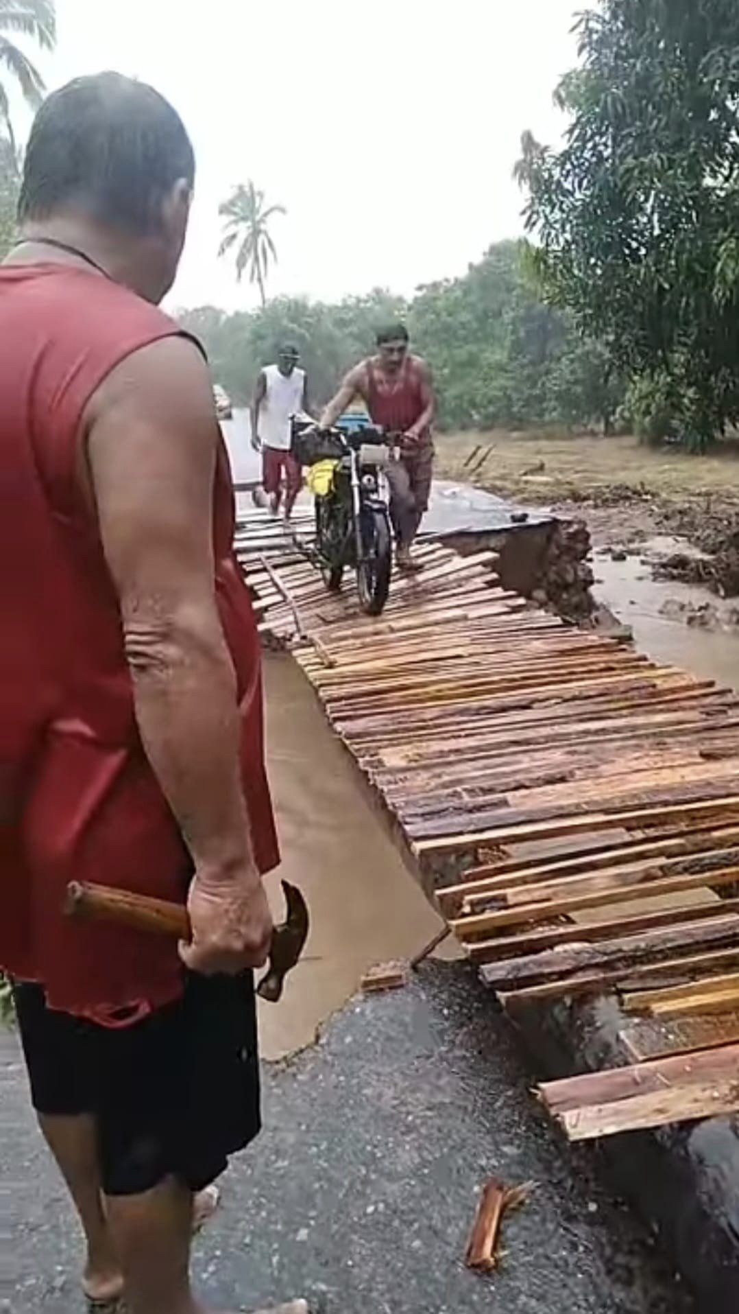 Ante esta emergencia, los habitantes han tomado la iniciativa de colocar troncos de palmas y algunas tablas para improvisar un puente que les permita acceder a otros lugares.