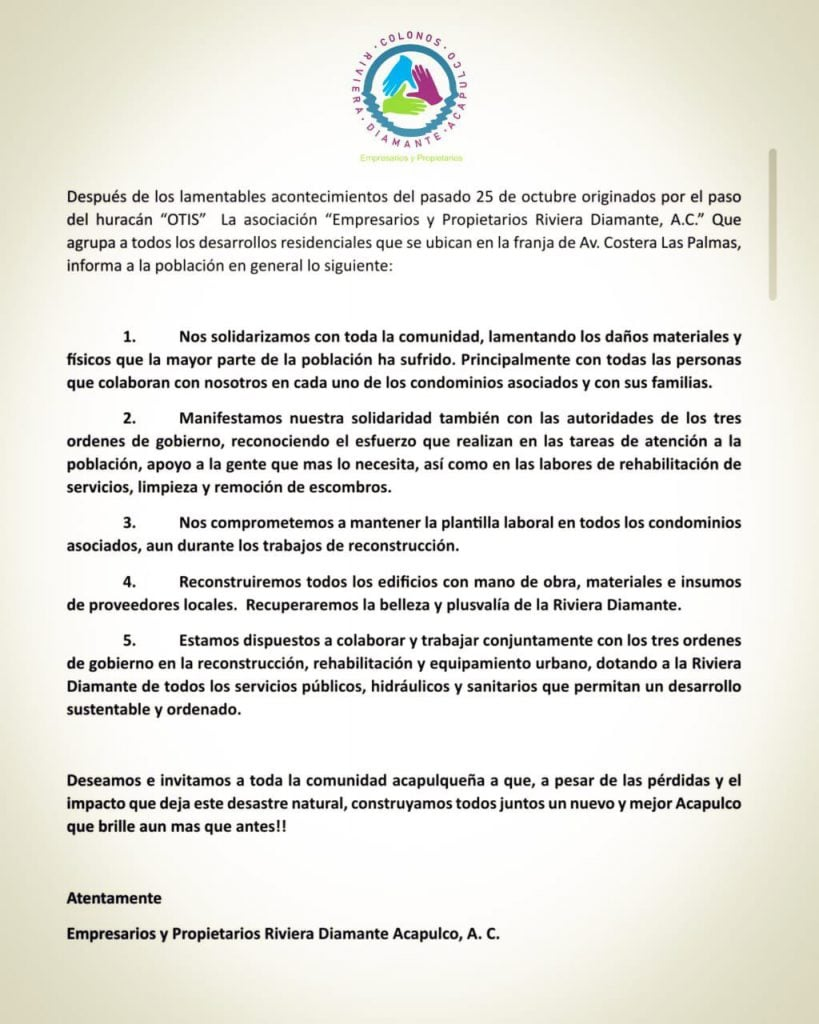 A través de su cuenta en una red social, la asociación informó que colaborará activamente con los tres niveles de gobierno en la reconstrucción, rehabilitación y equipamiento urbano de Riviera Diamante.