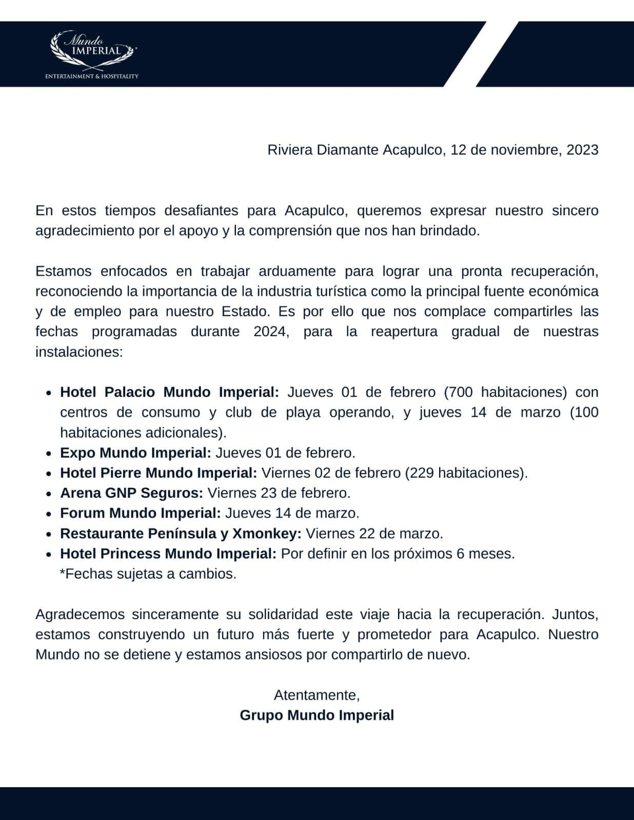 Grupo Mundo Imperial Anuncia Calendario de Reapertura Tras el Huracán Otis