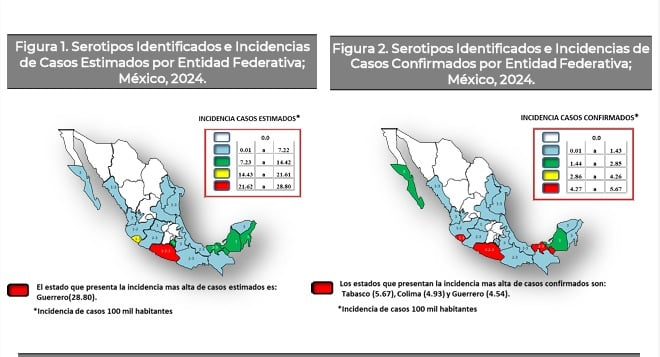 Es relevante señalar que el 75% de los casos confirmados a nivel nacional se concentran en Guerrero, Tabasco, Colima, Yucatán y Chiapas.