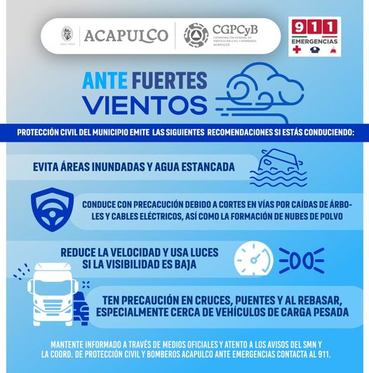 Acapulco de Juárez, 12 de abril 2024.- El Gobierno Municipal de Acapulco, a través de la Coordinación General de Protección Civil y Bomberos, lanzó una serie de recomendaciones dirigidas a los conductores ante las recientes rachas de viento que azotan la región costera.