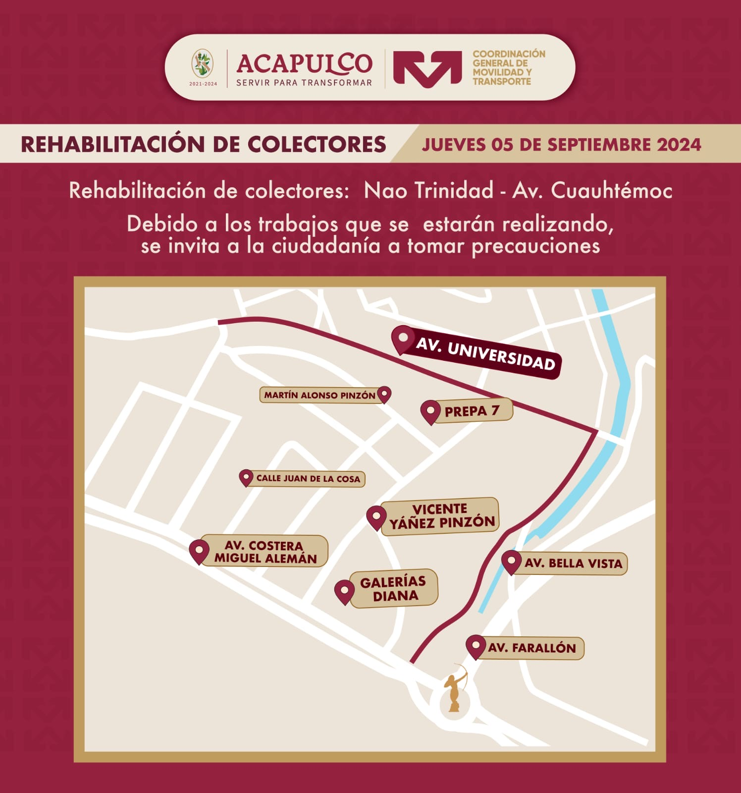 Acapulco de Juárez, 5 de septiembre 2024.-El Gobierno Municipal de Acapulco ha informado sobre el cierre temporal de un tramo de la avenida Universidad debido a los trabajos de «Rehabilitación del colector Nao Trinidad – Avenida Cuauhtémoc, tercera etapa de cinco».